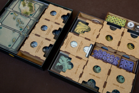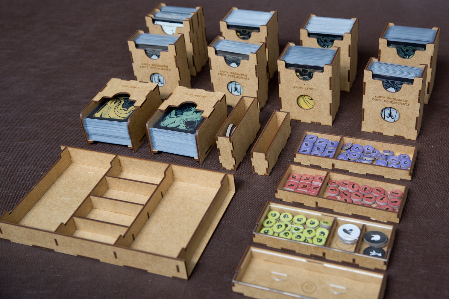 Insert posiada 2 podajniki na złożone talie Wiedźmy oraz Łowcy oraz 3 pojemniki na żetony do wyłożenia na stół pozwalające utrzymać porządek podczas rozgrywki.