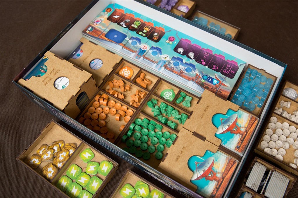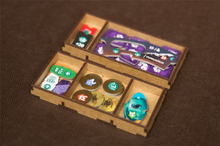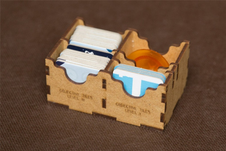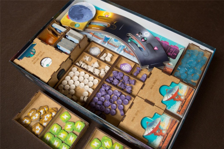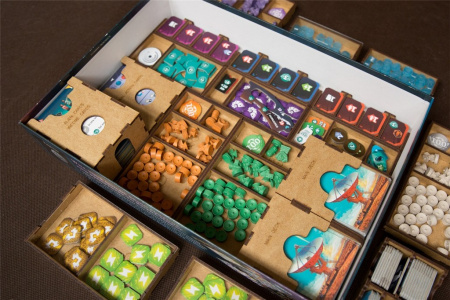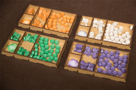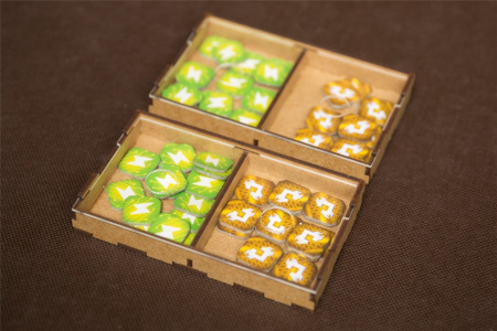 - pojemniki na kafelki technologii stanowią gotowe tacki do wyłożeni na planszę i zapobiegają rozsypywaniu się stosów ułożonych żetonów,