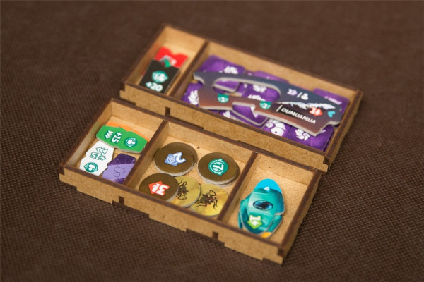 - wierzchnie pojemniki z żetonami i znacznikami są zasuwane pleksą co zapobiega wysypywaniu się elementów z uwagi na nieregularność kształtu plansz,
