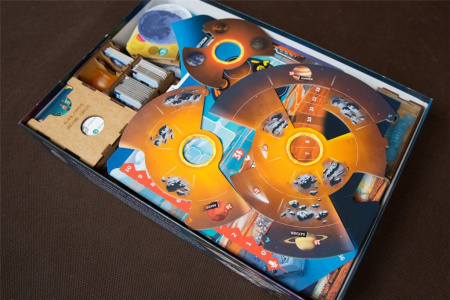 - 4 pojemniki / tacki z komponentami dla każdego z Graczy (znaczniki, sondy, znacznik rozgłosu, żeton 100/200 punktów zwycięstwa)
