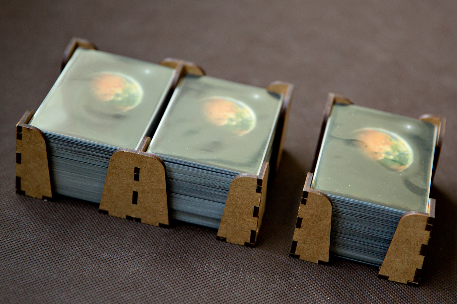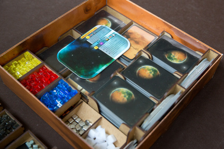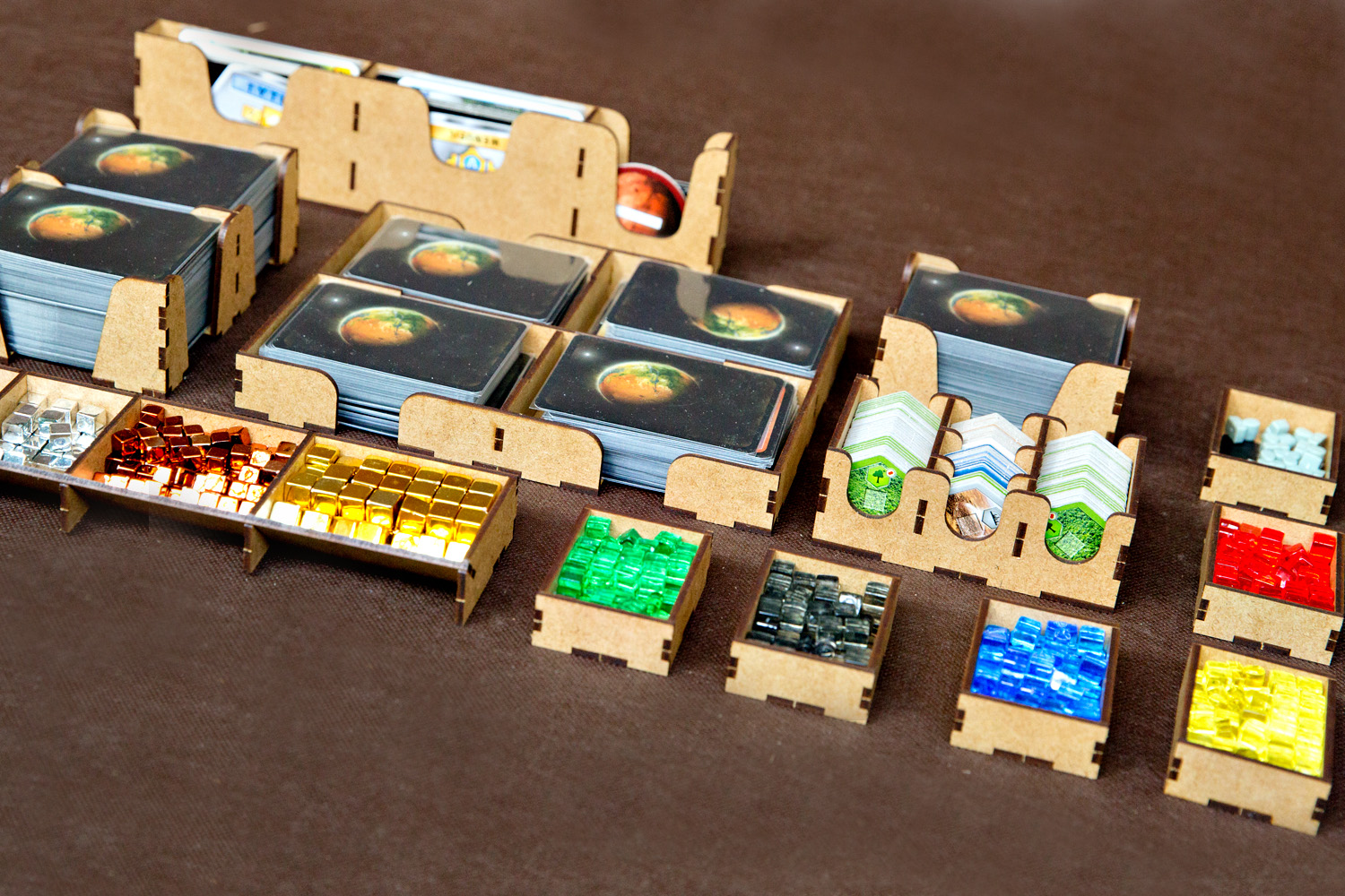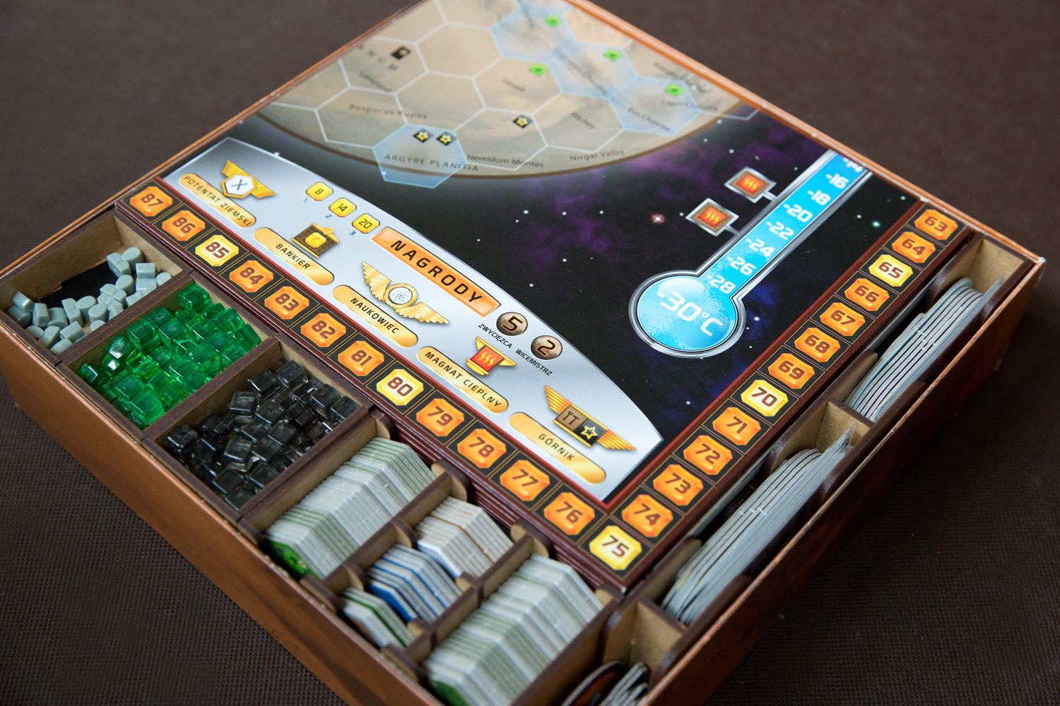 Insert do gry Terraformacja Marsa i dodatków Preludium, Kolonie, Niepokoje, Hellas i Elizjum, Wenus oraz Zestaw 5 plansz graczy. W środku są dwa podajniki na karty (jeden podwójny i jeden pojedynczy). Insert mieści karty w koszulkach klasy Premium.
