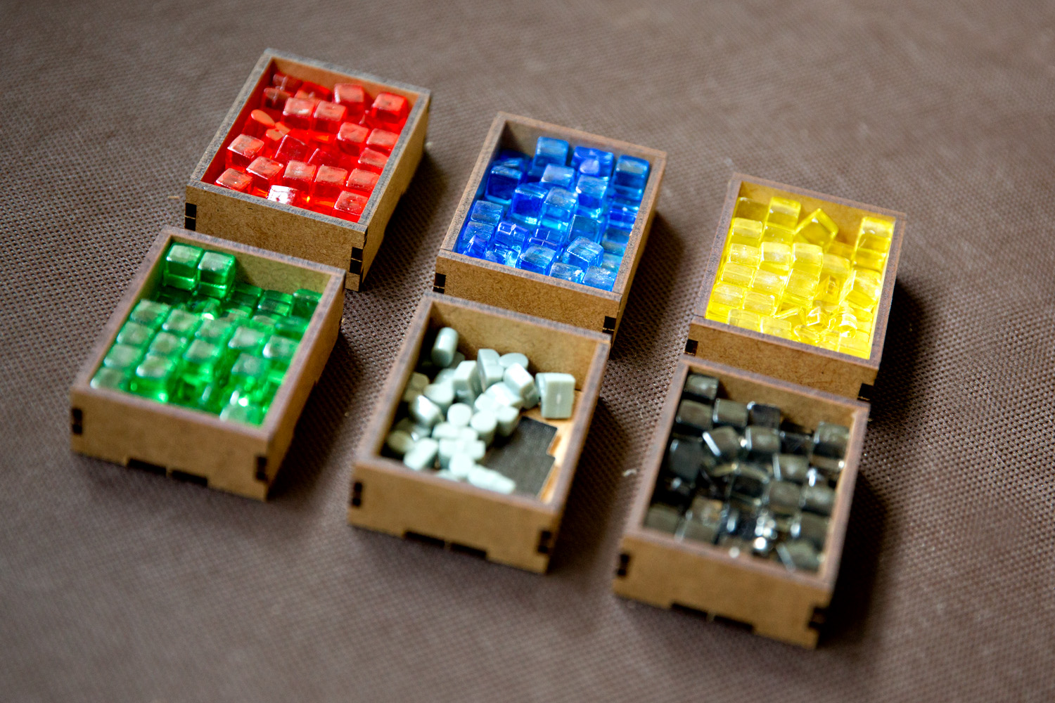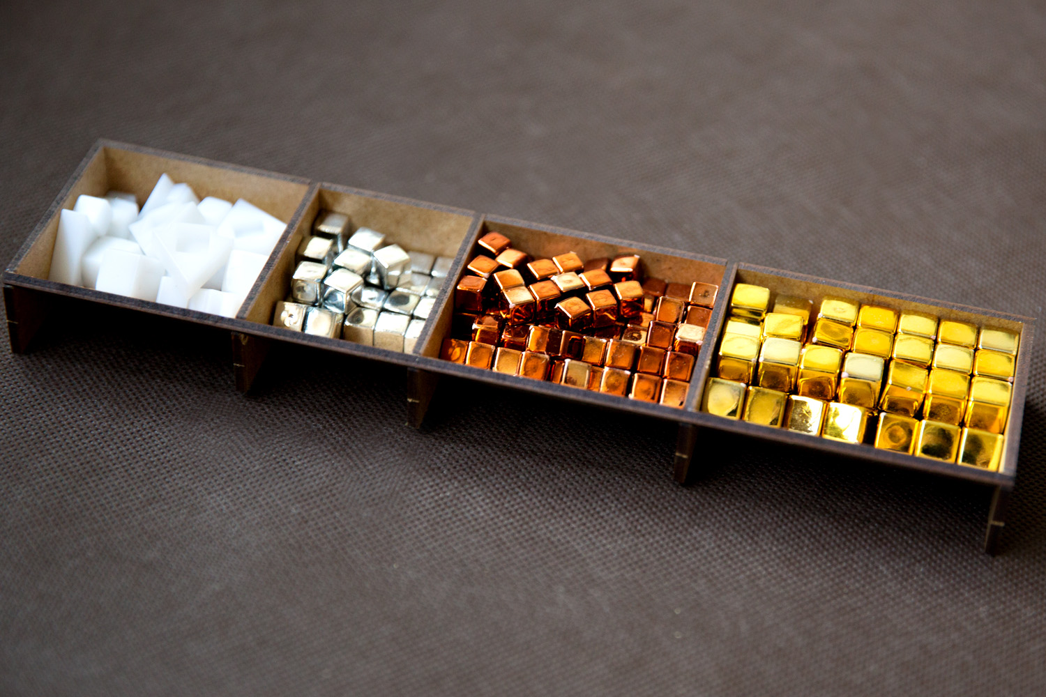 - pojemnik na megakredyty i białe znaczniki posiada ściętą ściankę ułatwiającą wyjmowanie żetonów,