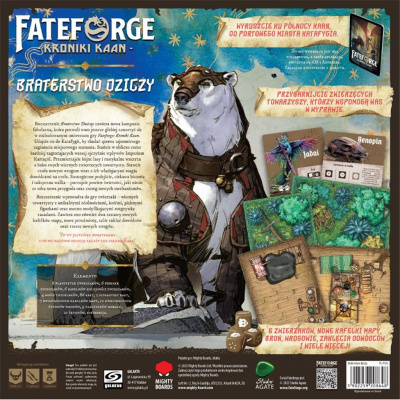 Fateforge: Kroniki Kaan - Braterstwo Dziczy to najnowsze rozszerzenie, które wprowadza do gry Zwierzęta, czyli lojalnych towarzyszy wspierających Was podczas wyprawy ku zamarzniętej północy. Będą one przy tym czymś więcej, niż tylko zwykłymi poplecznikami czy sojusznikami – to niemalże osobne postacie z własnymi planszetkami, unikatowymi zdolnościami, kośćmi akcji oraz figurkami. Udajcie się do portowego miasta Katafygii, by zbadać sprawę tajemniczego zaginięcia szamana przewodzącego jednemu z pomniejszych klanów Puszczy. Coraz mocniej odczuwalne wpływy Imperium Kartaçöl zagrażają waszej ojczyźnie, napawając wszystkich jej mieszkańców lękiem przed niechybną inwazją. Wraz ze swymi zwierzęcymi towarzyszami u boku będziecie musieli przemierzyć zdradliwe ostępy północnego Kaan, rozwikłać tajne intrygi i stawić czoła złowrogim siłom. Zmierzcie się z nowymi wrogami i stronnictwami, których uzbrojeni w talie zdolności dowódcy sprawią, że starcia będą jeszcze bardziej nieprzewidywalne i wymagające.  Przemierzajcie bujne lasy i rustykalne wnętrza, kolejne zakamarki świata przedstawionego na nowych zestawach kafelków mapy, w tym takich powiązanych ze scenami opowieści. Odkrywajcie nowe miejsca odpoczynku i sięgnijcie po potężne oręże oraz wyposażenie, które wspomogą Was podczas wyprawy.