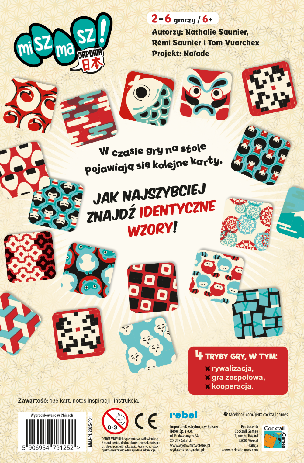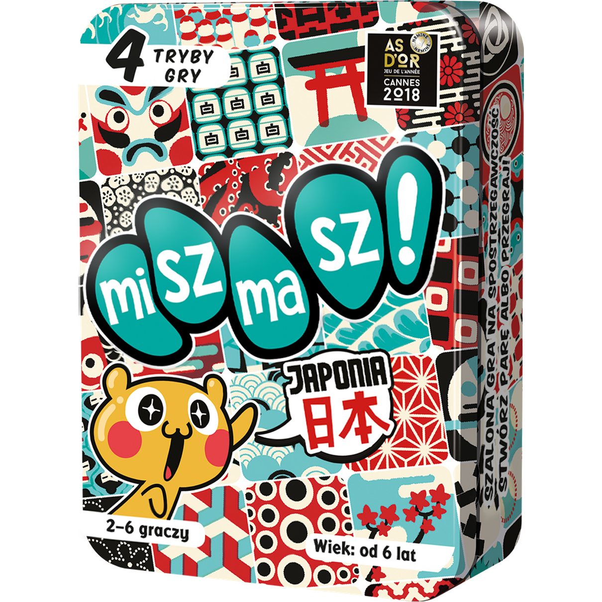Zwariowana gra imprezowa powraca, by znów zakręcić nam w głowach zestawem minimalistycznych grafik! Miszmasz! Japonia to wyjątkowo dynamiczna karcianka, w której ze stale zwiększającej się puli symboli staramy się wychwycić pary. Wyzwanie polega na tym, że obrazki są dość niewielkie, a do tego niezwykle wręcz spójne: geometryczne i zachowujące tę samą, prostą paletę kolorów.