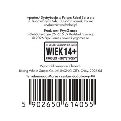 Zbuduj niezwykłe, kosmiczne miasto, które nie sąsiaduje z żadnym innym obszarem, wykorzystaj solidny plastik z marsjańskiego regolitu i odkryj zupełnie nowe wydarzenia globalne, które wpłyną na wszystkich uczestników gry! Terraformacja Marsa: Zestaw dodatkowy #4 to 12 kart projektów, 5 kart wydarzeń globalnych, 3 karty korporacji, które pozwolą Ci na rozwój w nieznanych dotąd kierunkach.