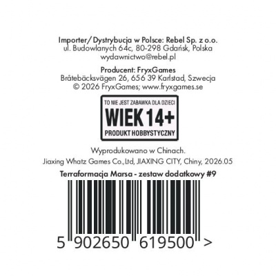Wykorzystaj zasoby tytanu z asteroidy Psyche 16, odkryj szerokie zastosowanie robozapylaczy i superkondensatorów, przygotuj się na lodowe uderzenie (i wykorzystaj je do własnych celów!) albo spróbuj przekierować nadmiar ciepła tam, gdzie będzie Ci najlepiej służył. Terraformacja Marsa: Zestaw dodatkowy #9 to 5 nowych kart projektów, które czekają na śmiałych inwestorów!