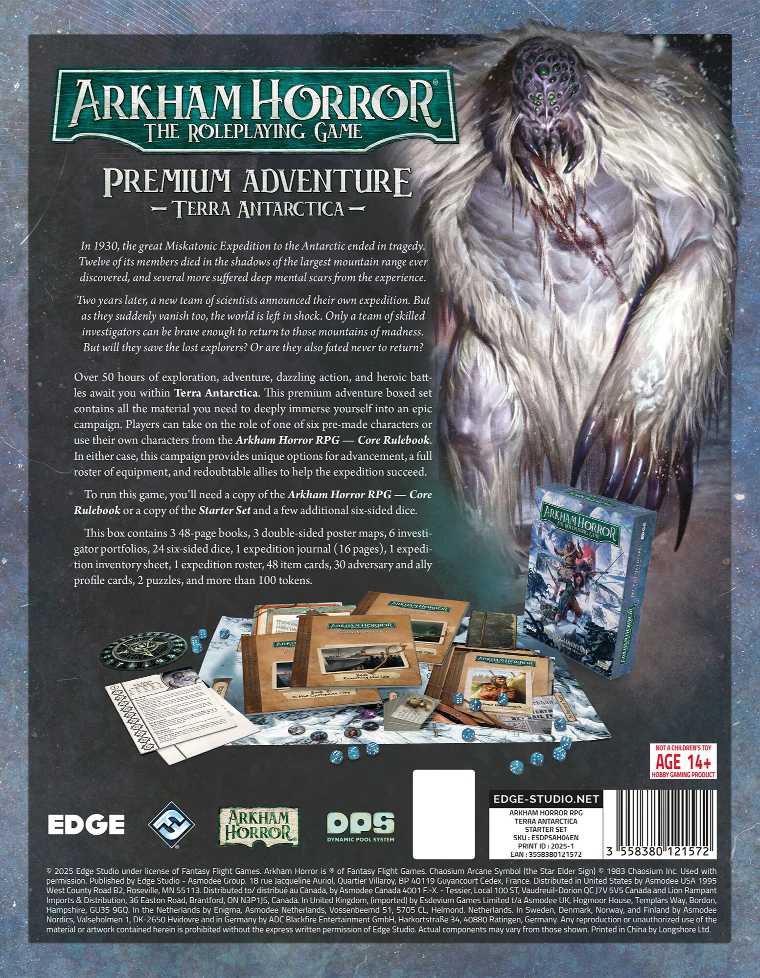 Arkham Horror RPG: Terra Antarctica to wyjątkowa przygoda będąca kontynuacją jednego z najsłynniejszych dzieł H.P. Lovecrafta: „W górach szaleństwa”. Zestaw zawiera wszystkie niezbędne elementy pozwalające rozegrać wciągającą kampanię pełną eksploracji, przygód i heroicznych bitew. Podczas rozgrywek możemy wcielić się w 1 z 6 gotowych postaci lub stworzyć własne w oparciu o podręcznik podstawowy. Niezależnie od tego, na co się zdecydujemy, czekają na nas unikalne opcje awansu, oryginalne wyposażenie i wyjątkowi sojusznicy, którzy staną na drodze uczestników ekspedycji.