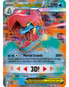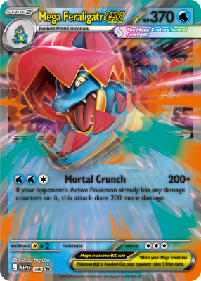 Zbuduj więź, która pozwoli Twojemu Pokémonowi przekroczyć granice swojej mocy dzięki Mega Ewolucji! Dzięki kłapiącym szczękom i ostrym pazurom Mega Feraligatr ex namierza osłabione Pokémony przeciwnika, zadając atak Mortal Crunch!