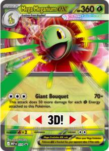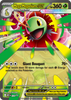 Zbuduj więź, która pozwoli Twojemu Pokémonowi przekroczyć granice swojej mocy dzięki Mega Ewolucji! Rozkwitając nową potęgą, Mega Meganium ex zasypuje Pokémony przeciwnika przy pomocy ataku Giant Bouquet, zadając ogromne obrażenia!